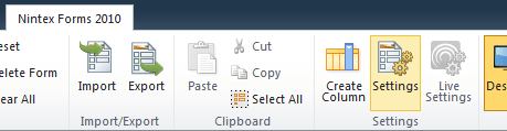 In order to customize the CSS for the form, you need to access the settings for the form itself. This is a link on the ribbon in the “Nintex Forms 2010” section called “Settings”.