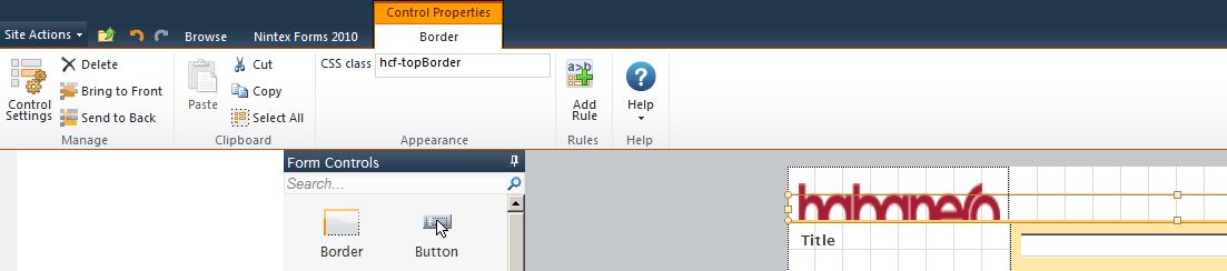 Next we’re going to customize the border. There aren’t many options in the ribbon for customizing the border control other than adding a class (which I added as “hcf-topBorder” just in case).