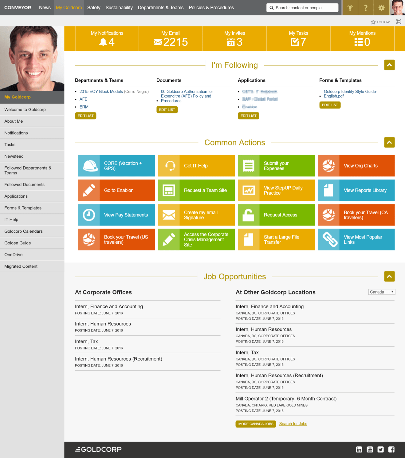 Another way is to create and design a space that helps employees pulls together most of the information they need. For just one example, see the following screenshot from the Goldcorp employee portal and read this case study.