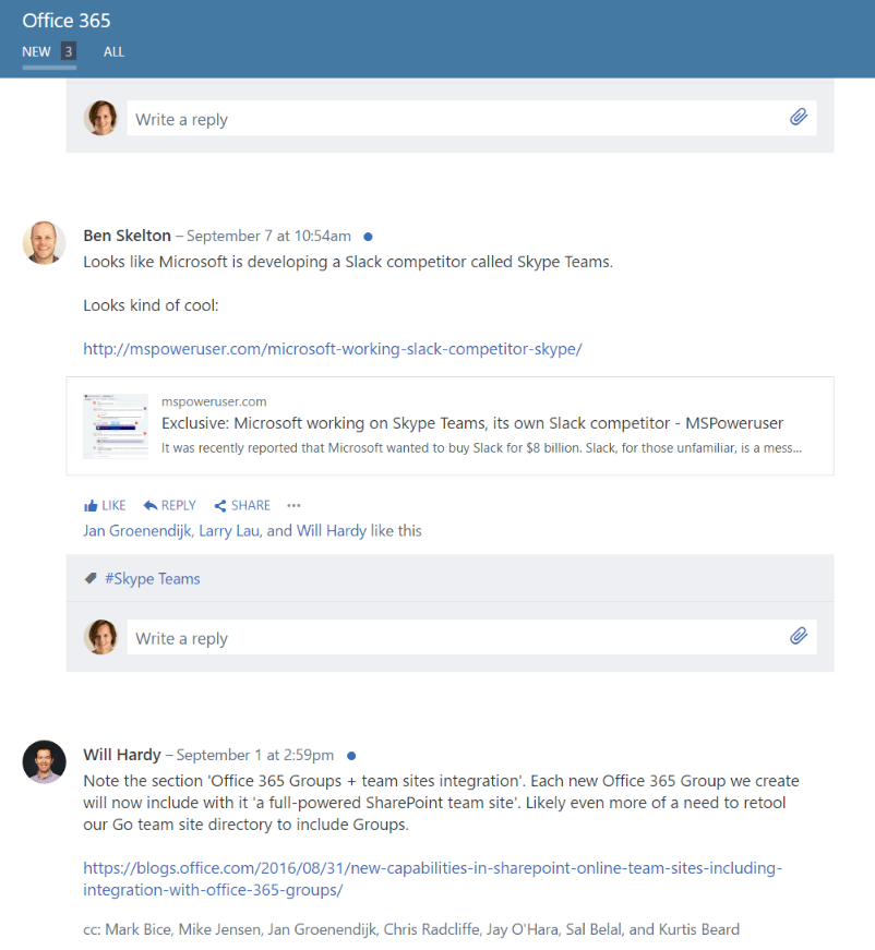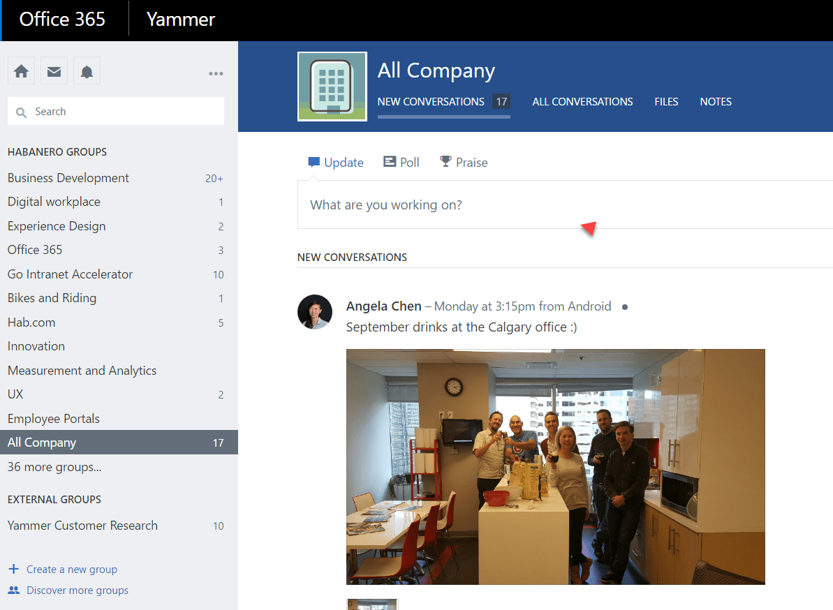 At Habanero, one way we support employees sharing their knowledge and skills—whether it’s about Office 365, employee portals, measurement and analytics, experience design, etc.—is a social enterprise tool. That way, anyone interested in a topic can participate, not just the people who got included in the “To” field of an email.