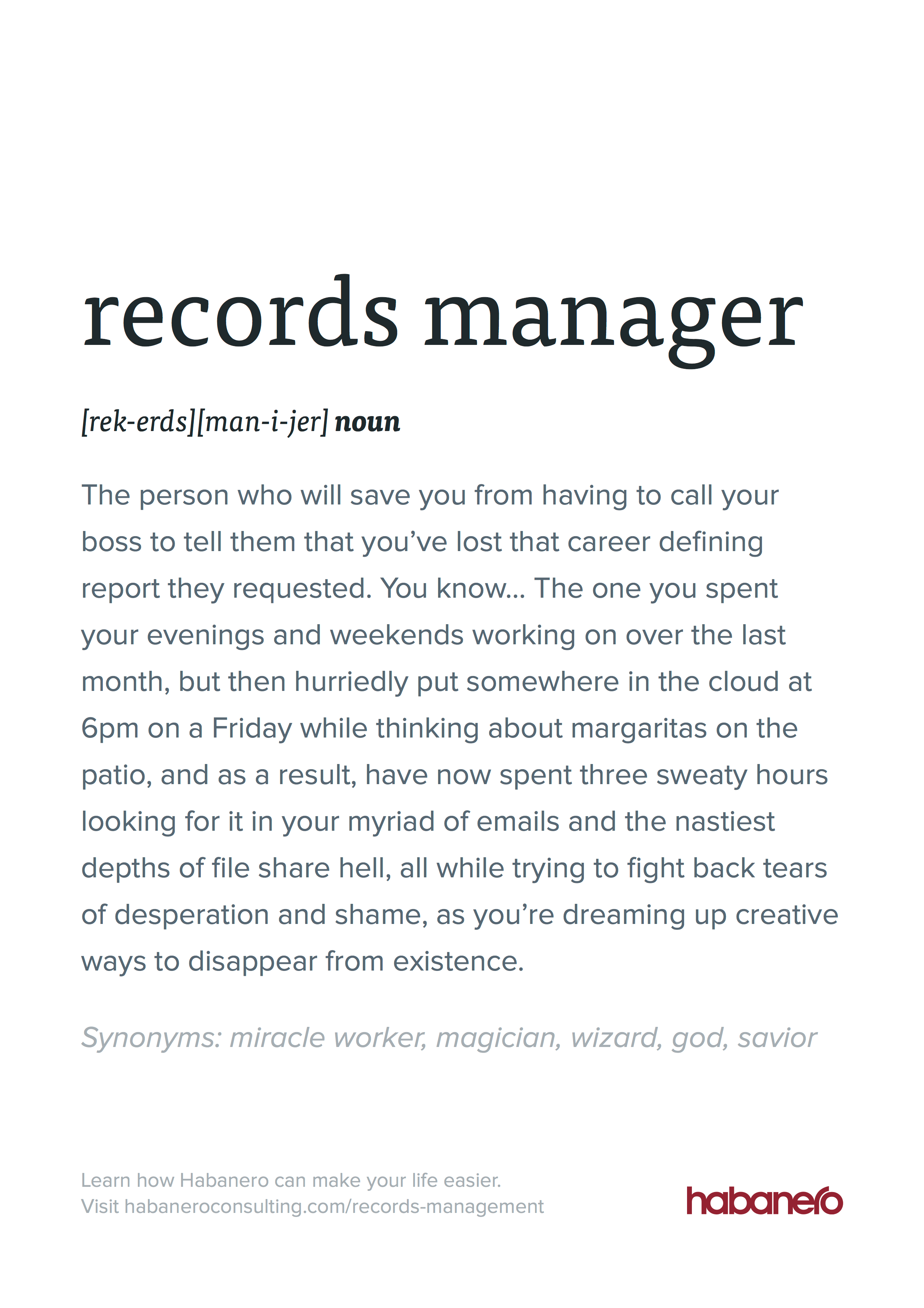 So if you are a records manager, thank you for looking after all of us so well, even though we are often lazy and non-compliant! We respectfully salute you for your diligence and the burden you carry. If you are not a records manager, but you know one, give them a pat on the back, or a hug if that's not too weird, and maybe one of our posters, and thank them for doing such an important job!