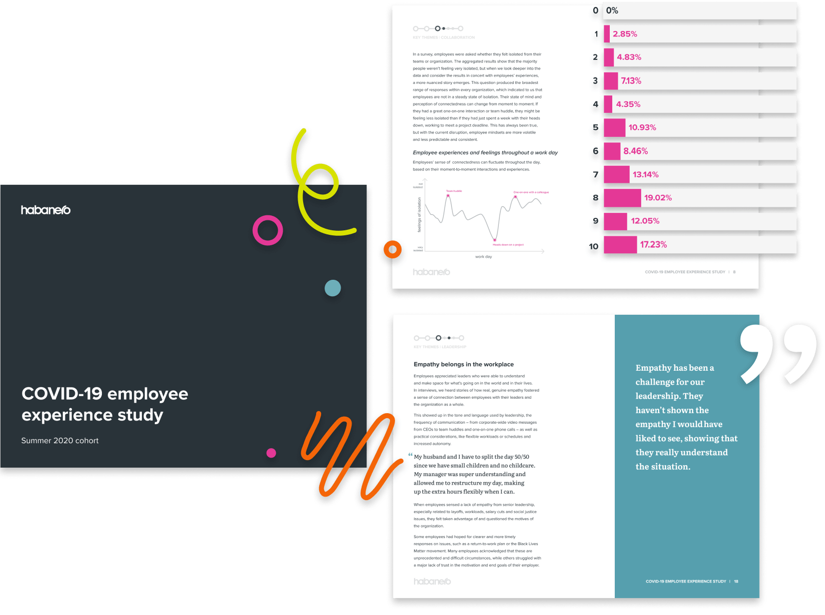 Our study showed that surveys alone can’t give a full picture of how people are doing. We need mixed methods research to drive human-centred action. We also saw how slow-moving organizations struggled to sense and adapt to rapid change. Embedded agile behaviours will be a key survival tool. Finally, we learned that vulnerable, human leadership had a big impact on the employee experience, suggesting that empathy must be a core leadership capability.