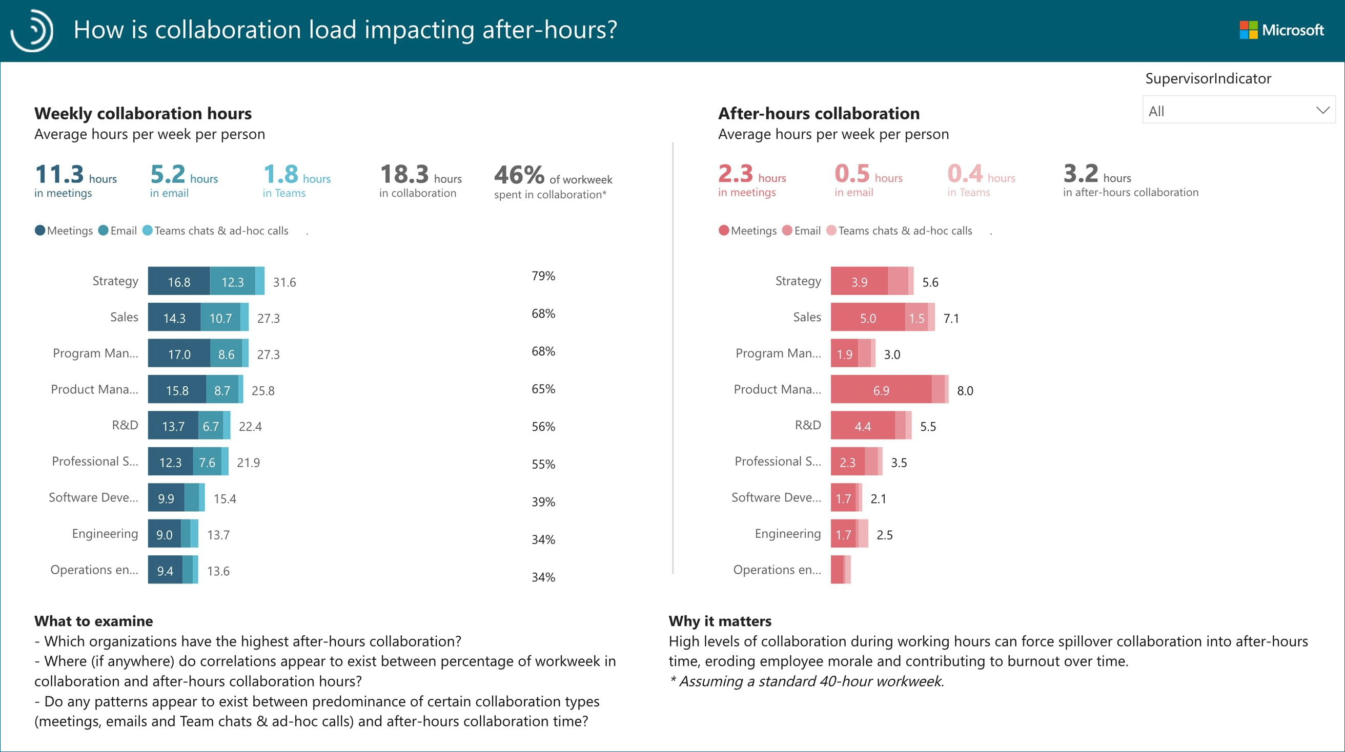 Workplace Analytics Power BI dashboards help you analyze workplace patterns and quickly pinpoint hot spots for further investigation. These directional insights allow your organization to understand where changes can positively impact collaboration, productivity, organizational culture and manager effectiveness. Microsoft Viva Insights Workplace Analytics empowers leadership to make data-driven decisions and create meaningful and sustainable changes.