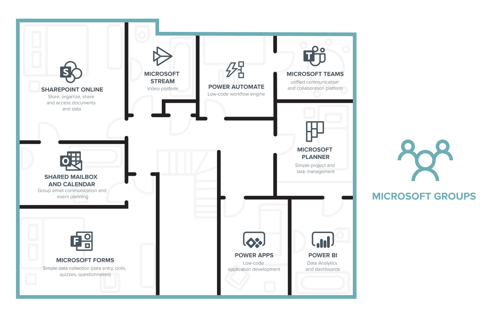 If you think of a Microsoft 365 Group like a house, its rooms might look something like this: