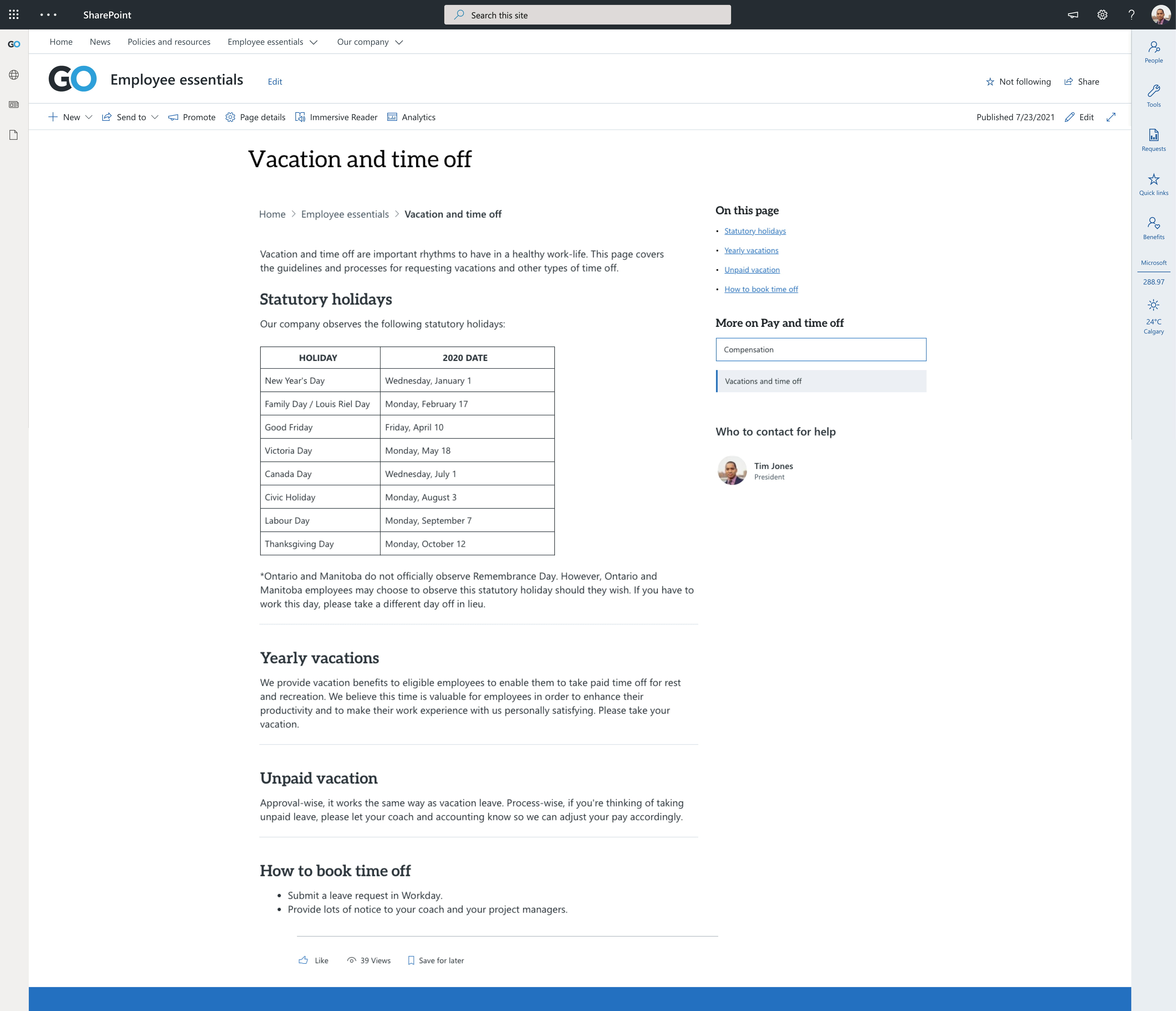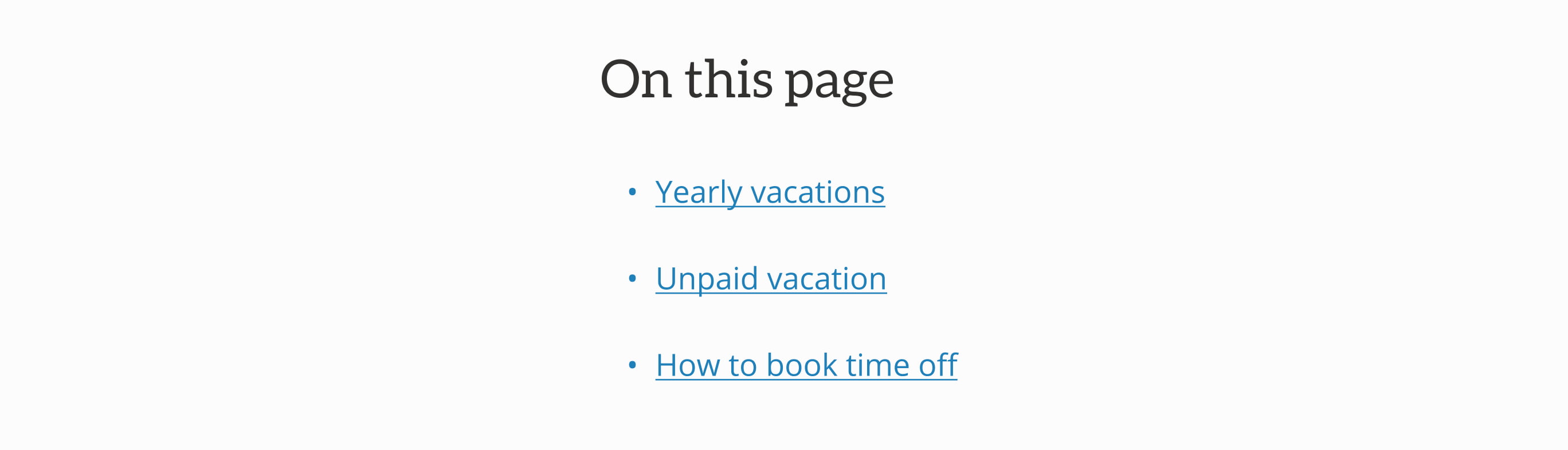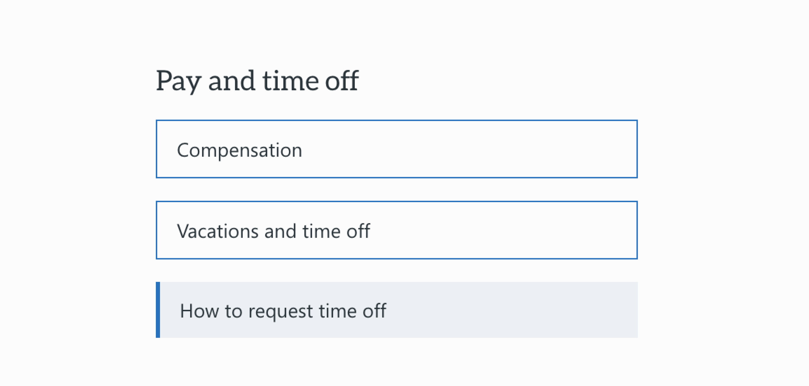 We recommend defining jobs for all your page templates. For example, a content page on your intranet might be titled “Vacation and time off.” Its job is to explain your organization’s vacation policy and describe how to book days off.