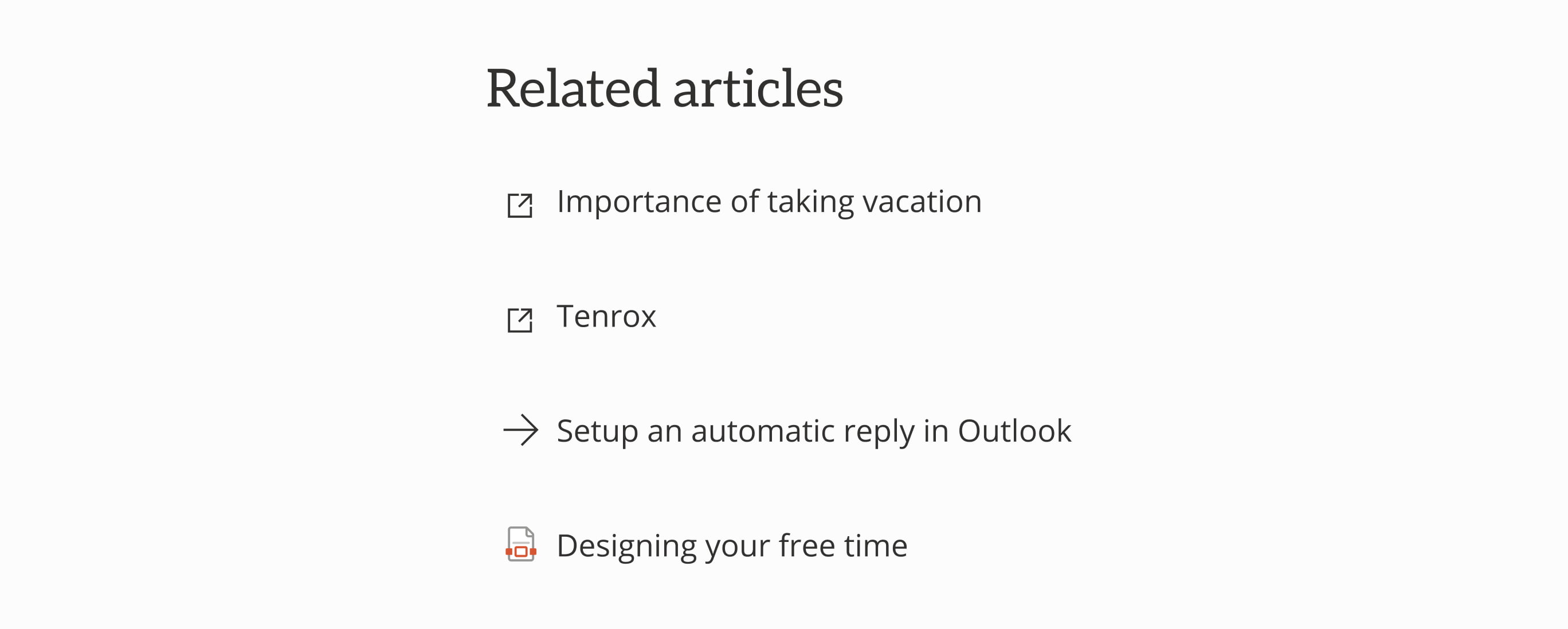 - For related resources, use icons to indicate document type (PDF, Word, Excel) or location (like an external icon if the link takes the employee off the intranet).