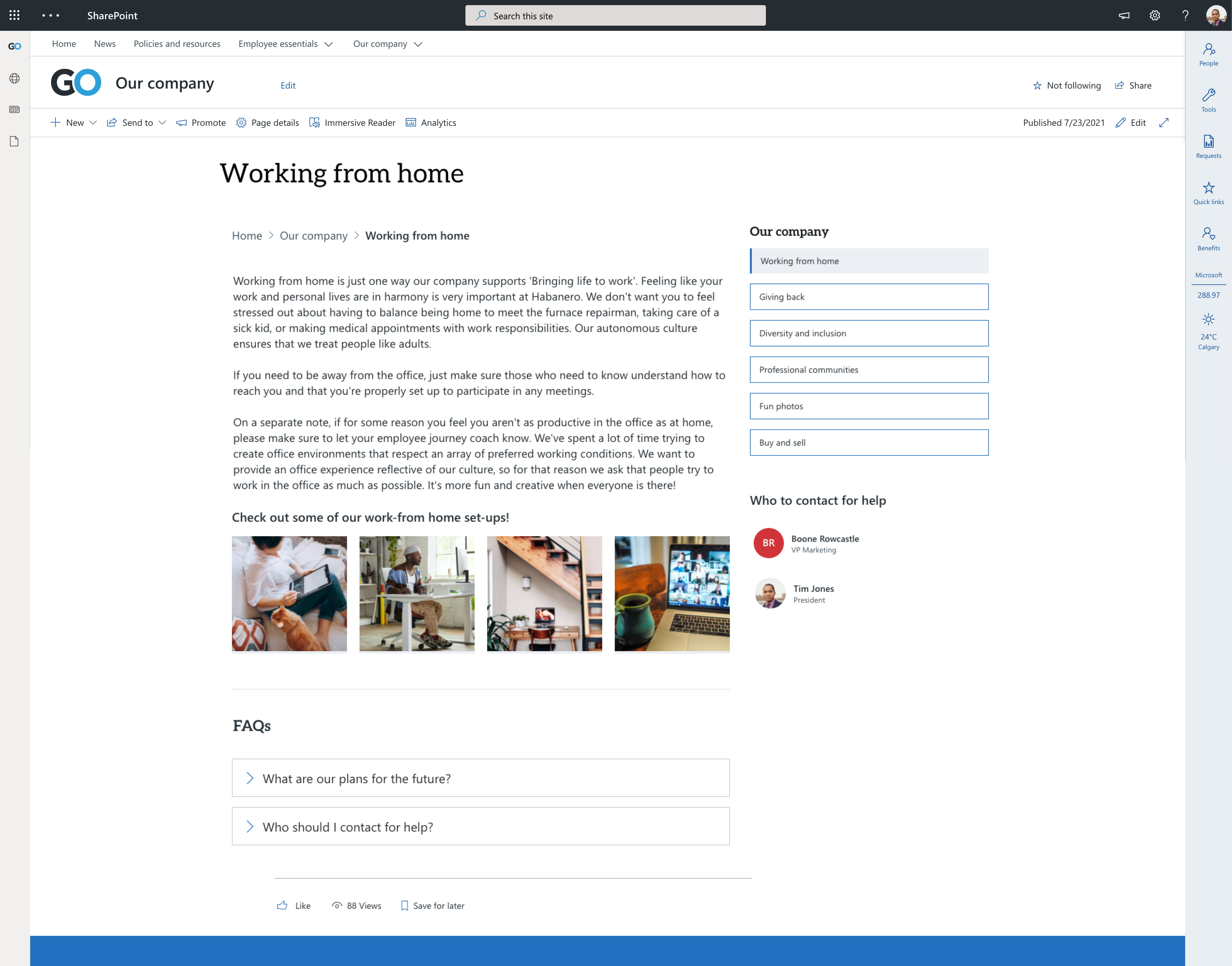 The people web part links directly to a content author, giving employees someone to talk to if they get stuck or can’t find what they’re looking for. If your content is owned by a team rather than an individual, you can use text links or buttons to link to group emails, such as it@yourcompany.com.