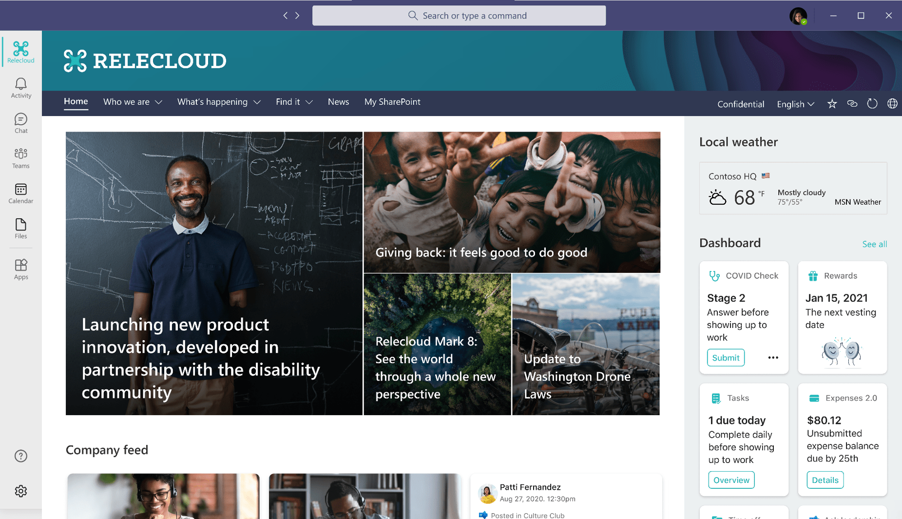 Like all of Viva’s pillars, Connections is anchored in Microsoft Teams. It functions as a gateway to content hosted in SharePoint, Yammer, and other M365 applications and links to other capabilities within Viva, such as Learning and Insights. When Viva Connections is enabled, you’ll see a link added in the left-hand rail within Microsoft Teams, which gives you the ability to brand it as your own with a header and name.