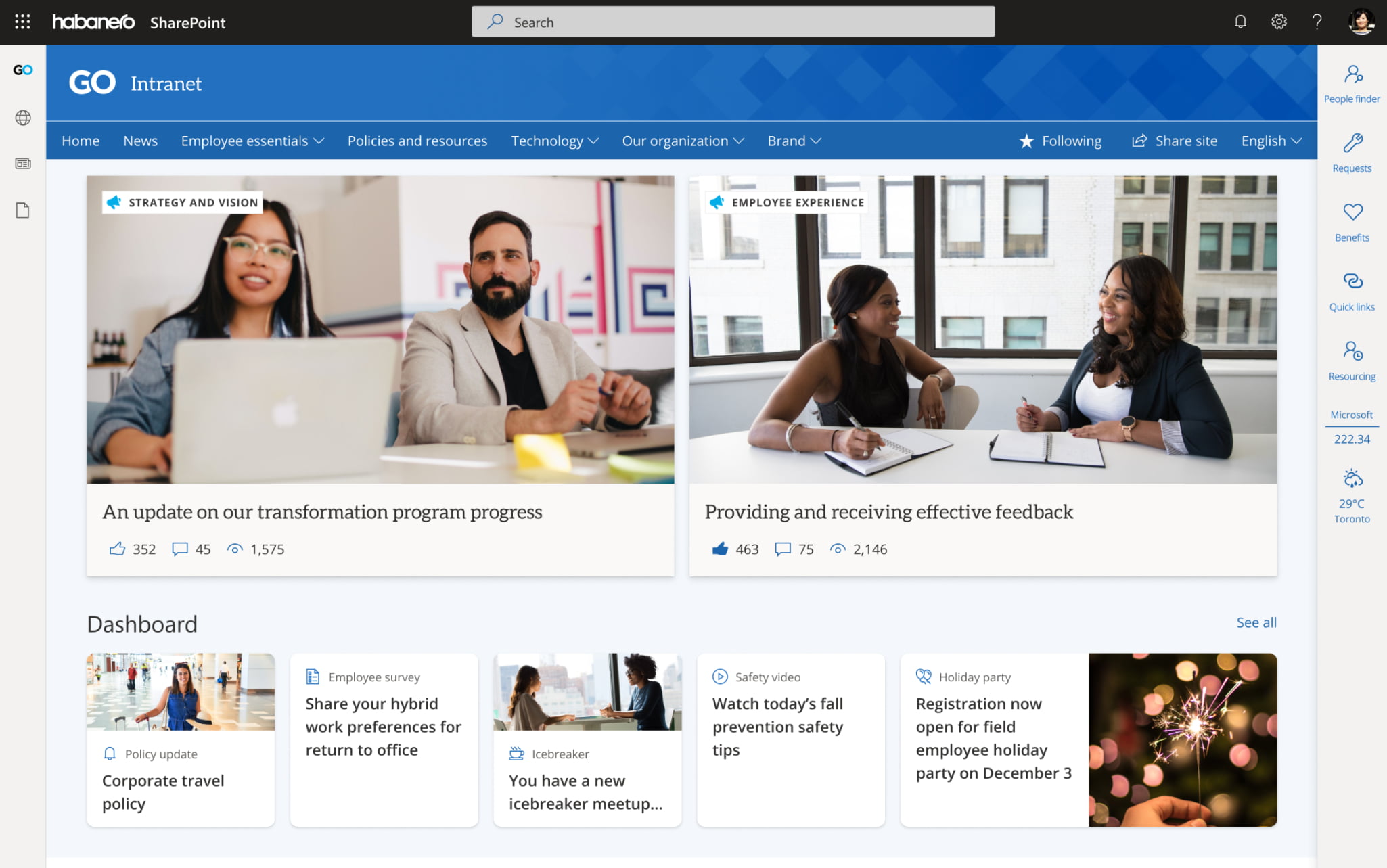- Support for a next-generation intranet experience built for modern SharePoint that includes preference-based content delivery, integration with other enterprise applications such as ServiceNow and engaging features like employee recognition.