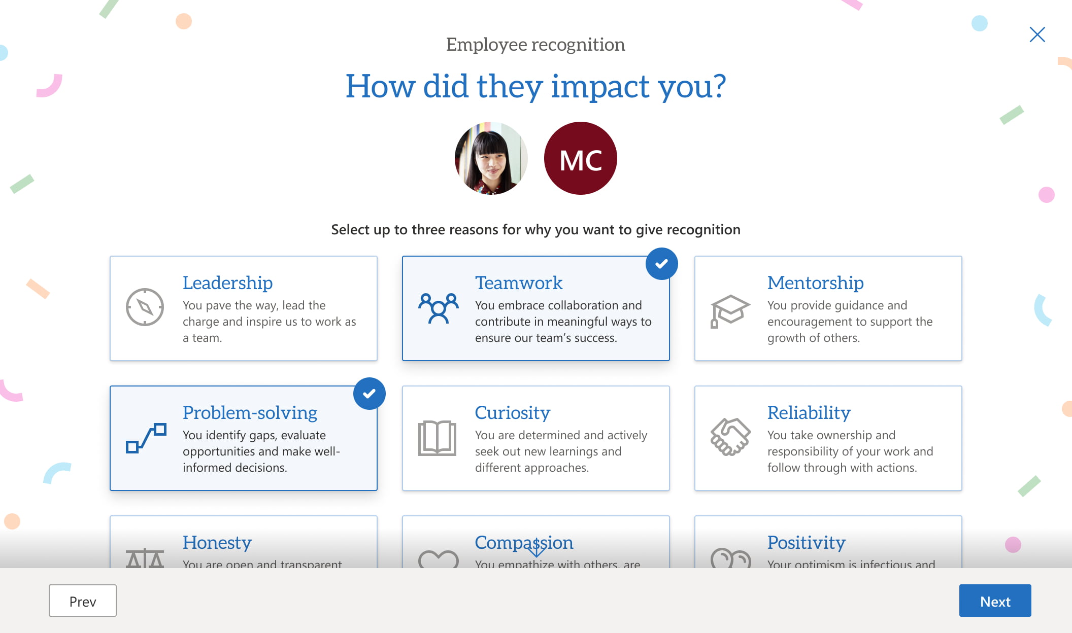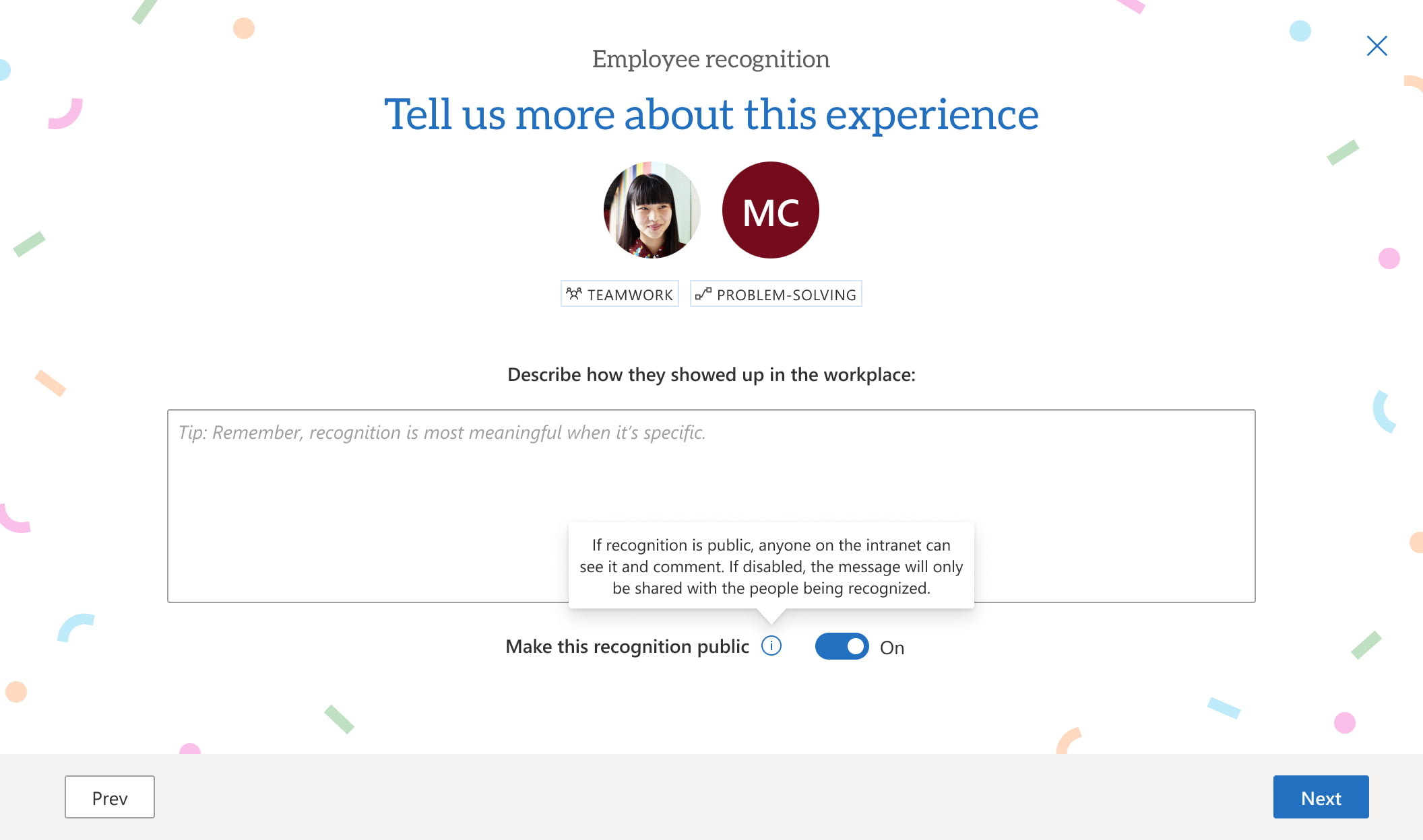 We designed the experience in GO Intranet to prompt employees to select up to three reasons they want to recognize their colleague. Organizations can configure these categories to align with their values or to support a culture change project. They then have an opportunity to further describe the positive impact the employee has had in their own words.