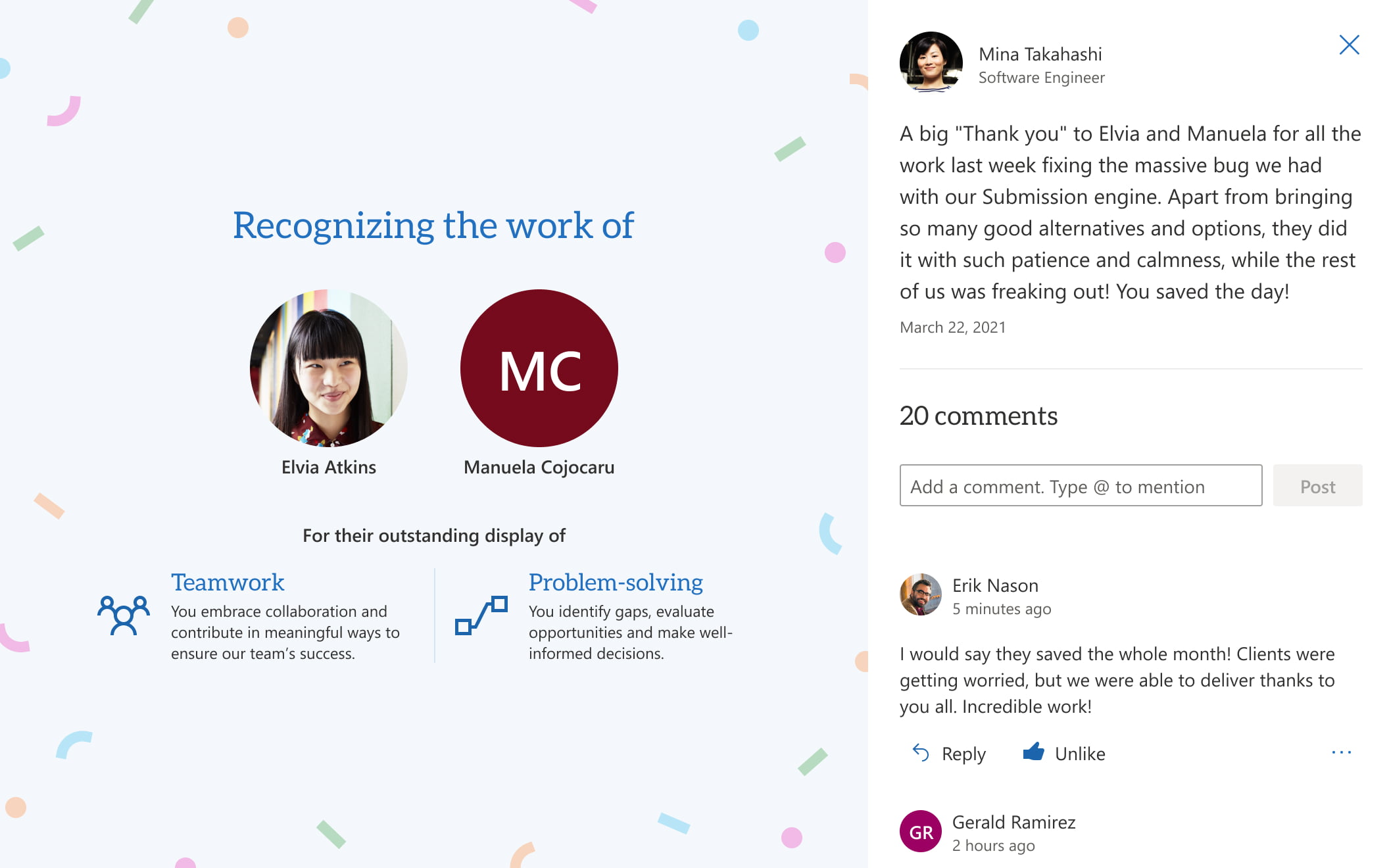 Recognition in GO Intranet gives employees the ability to comment on public recognition, which encourages others to “pile on” their praise.