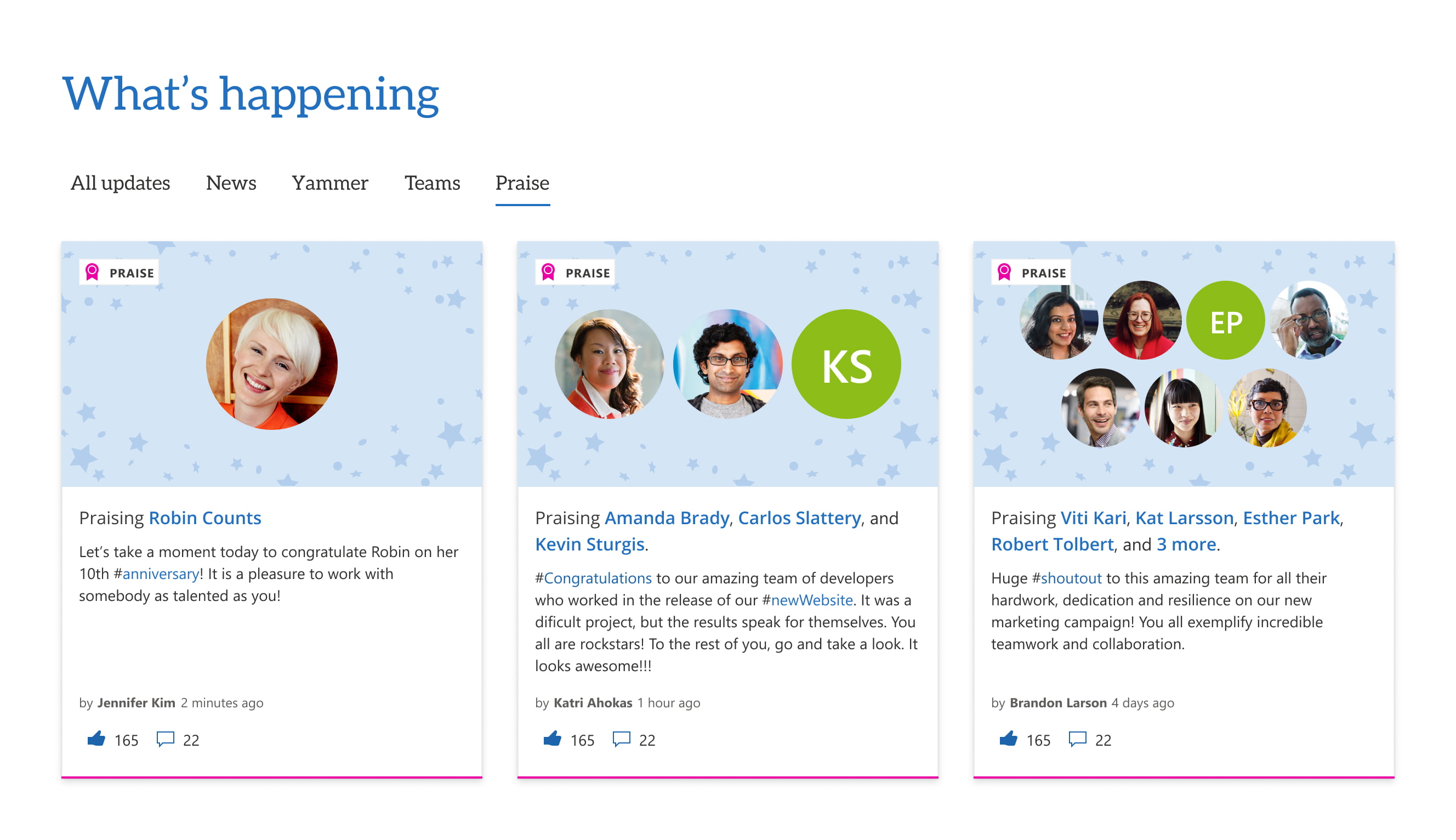 Not all organizations need a dedicated recognition module on their intranet. If employees are already actively using other channels like Yammer or Microsoft Teams for recognition, the job is to aggregate recognition and make it more visible across the organization. In GO, our “what’s happening” rollup on the homepage surfaces recognition from these Microsoft 365 channels so everyone can see them.