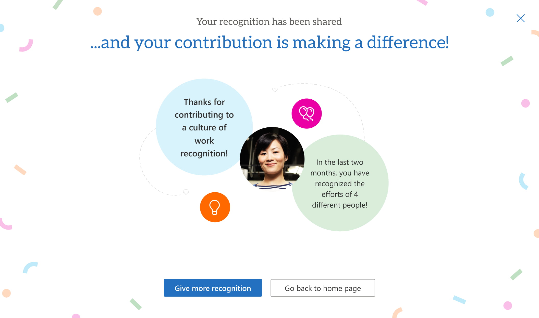 We wanted to reinforce this culture of gratitude in GO by “recognizing the recognizers.” Each time employees offer recognition, they receive a confirmation along with a summary panel that acknowledges their contribution. It’s a seemingly small part of the experience that can have big impact by connecting employees’ individual actions directly to their workplace’s culture.