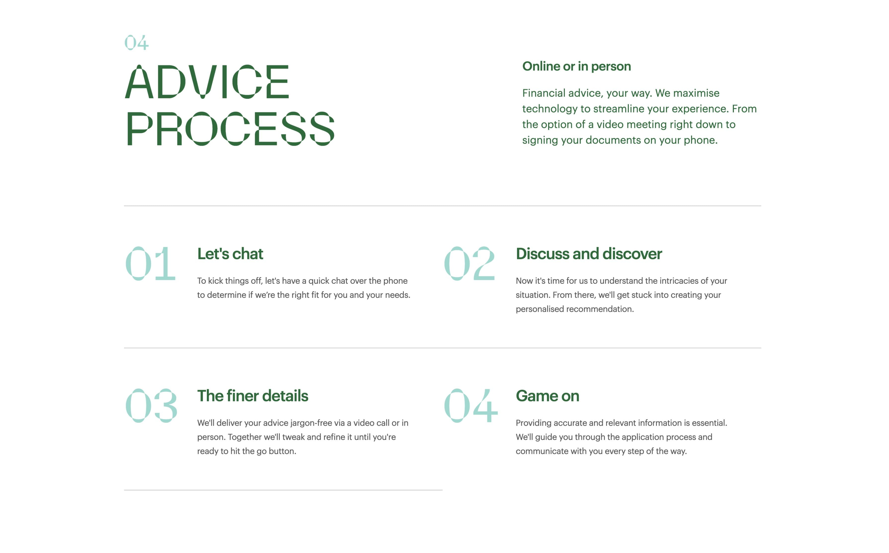 Headings are essential for scanning, so even though it might be tempting to use a more unique, visual striking typeface, we have to prioritize their purpose. An example of choosing style over function is the Finsol website, which uses the Parabole typeface for headings. In particular, characters such as “H” and “X” are almost indistinguishable. The use of all caps further reduces the reader's ability to scan content.