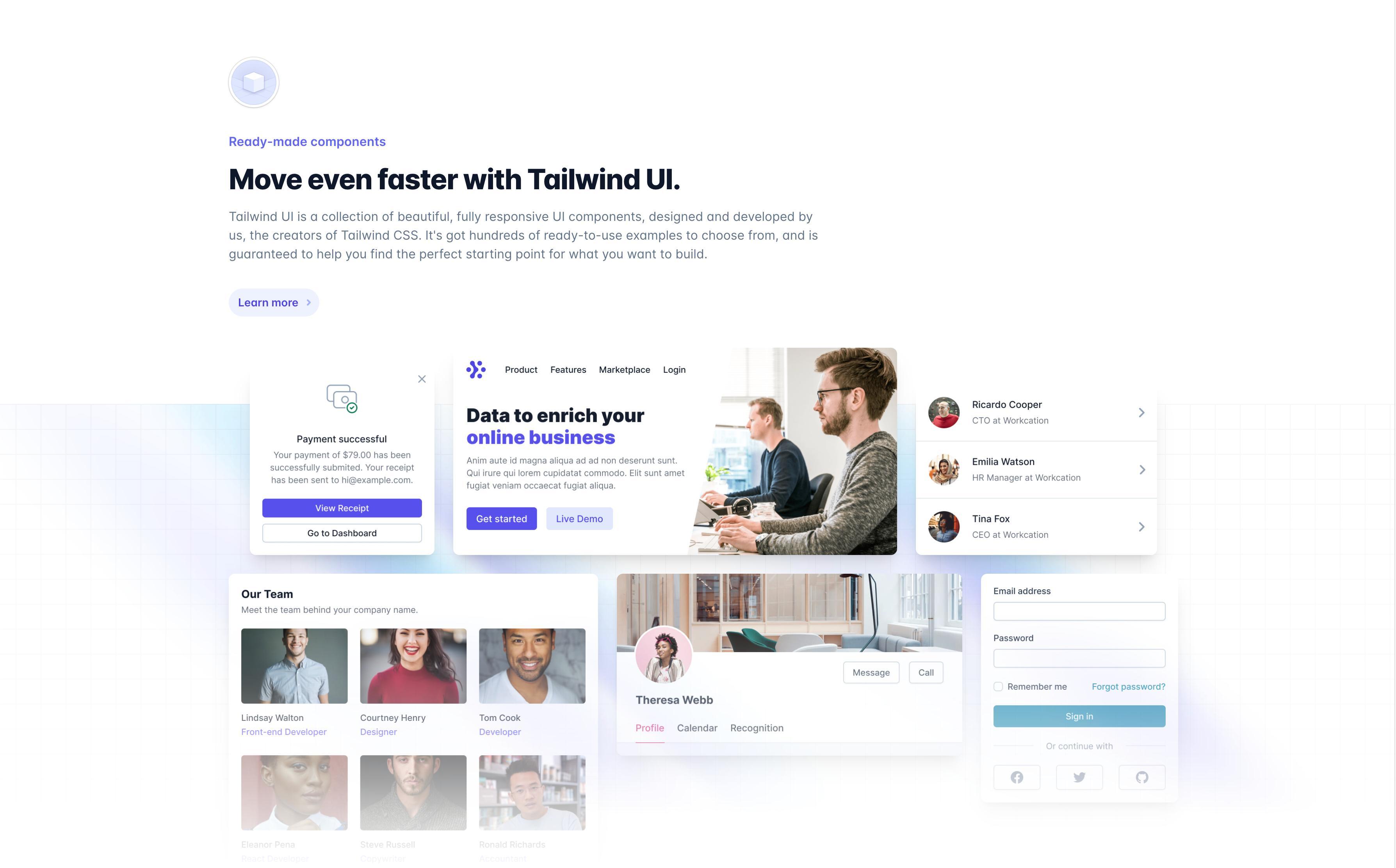 Some companies, like Tailwind CSS, use more simple typefaces for their brand. In this case, they’re using Inter, a highly legible and readable typeface. Not only does it have nine different weights, but it was also specifically designed for computer screens. This is the perfect example of a typeface that suits the purpose of its application – Tailwind is a UI framework, so Inter needs to work well at multiple sizes and in different components.