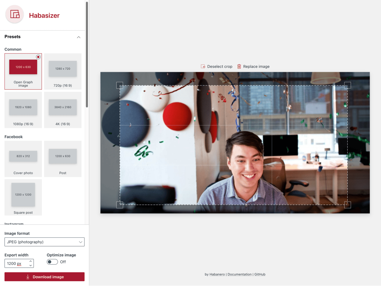 Habasizer is primarily an image resizer that can crop images to a specific aspect ratio. But it goes further: it also can resize and optimize your image, preparing it for use directly on your website or on social media.