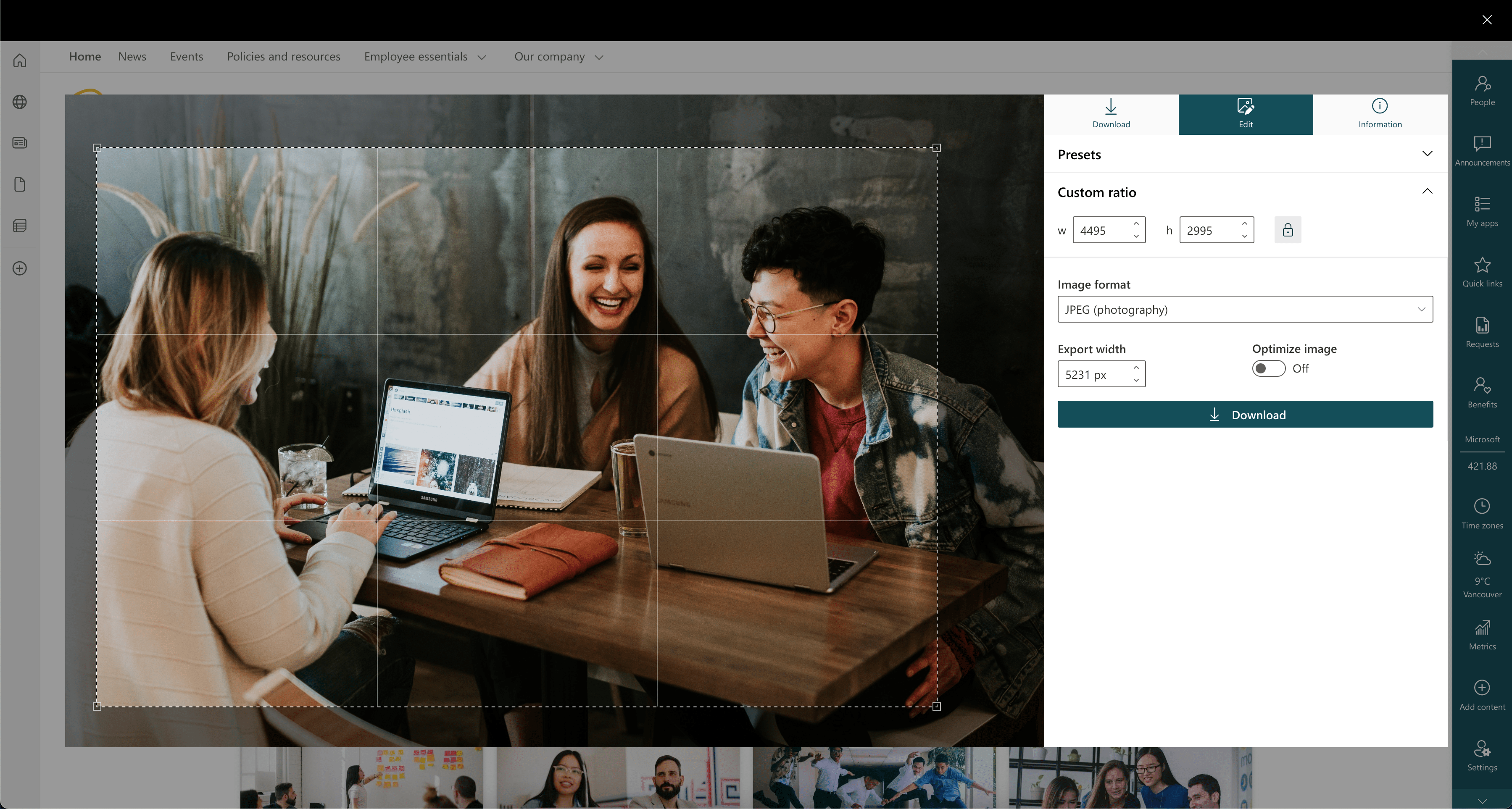 We found that, similar to website content authors, communicators and intranet managers also struggled with cropping, resizing and downloading optimized images. They needed to download imagery to use on their SharePoint site or PowerPoint presentations, or save an image in another file format. Now they can visit one place and download the size and format of photo that they need.