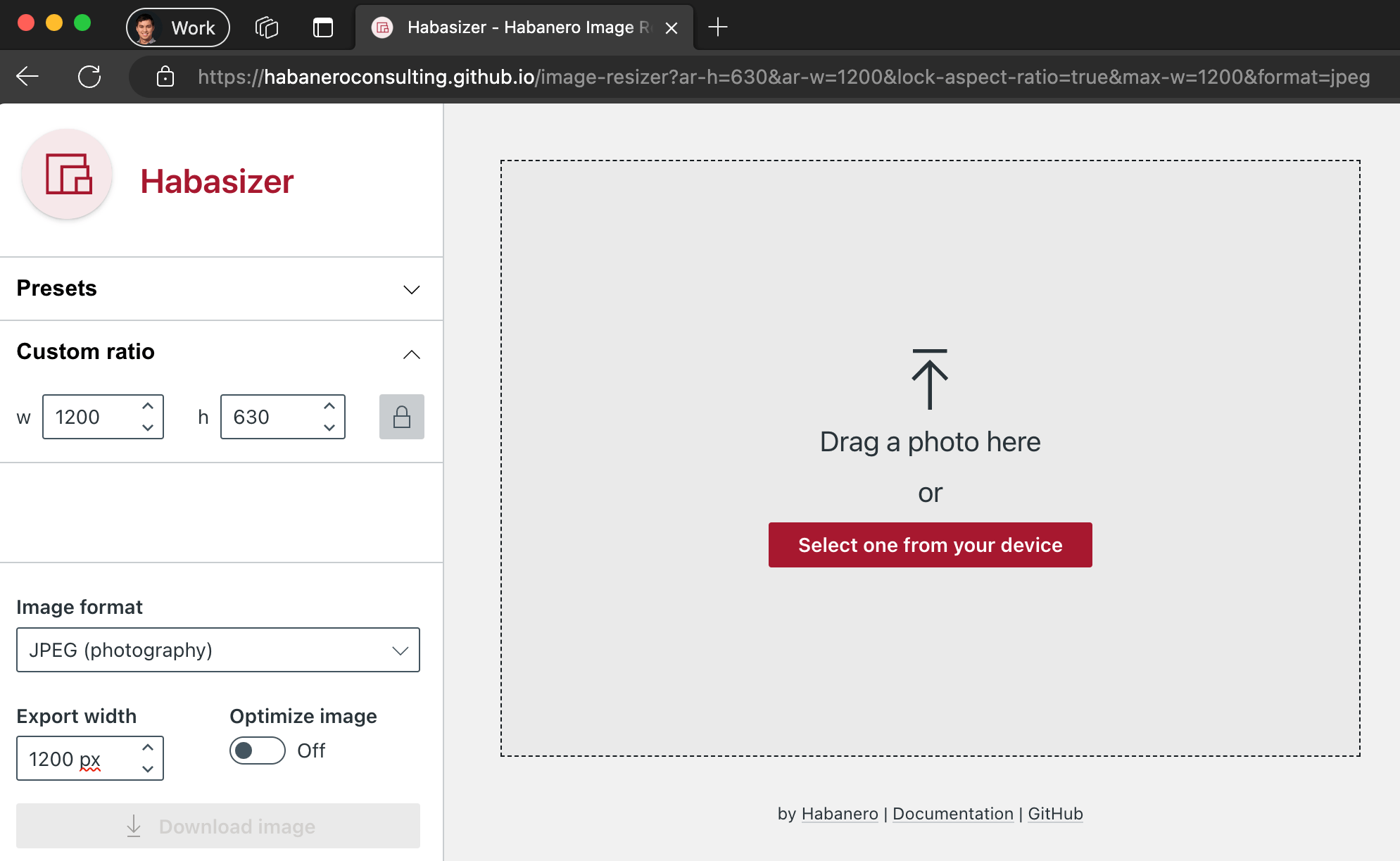 You can also create a link to the Habasizer with a preset aspect ratio, image width, image format and optimization (or not). After you update the image options, the URL of the page will change to preserve your changes. You can bookmark these links or embed them within your style guide or your CMS for quick access.