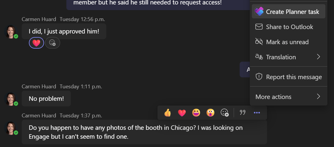 On the message you want to turn into a task, select the ellipses (…). From there, select Create Planner task (this may be under More actions if you haven’t used it before).