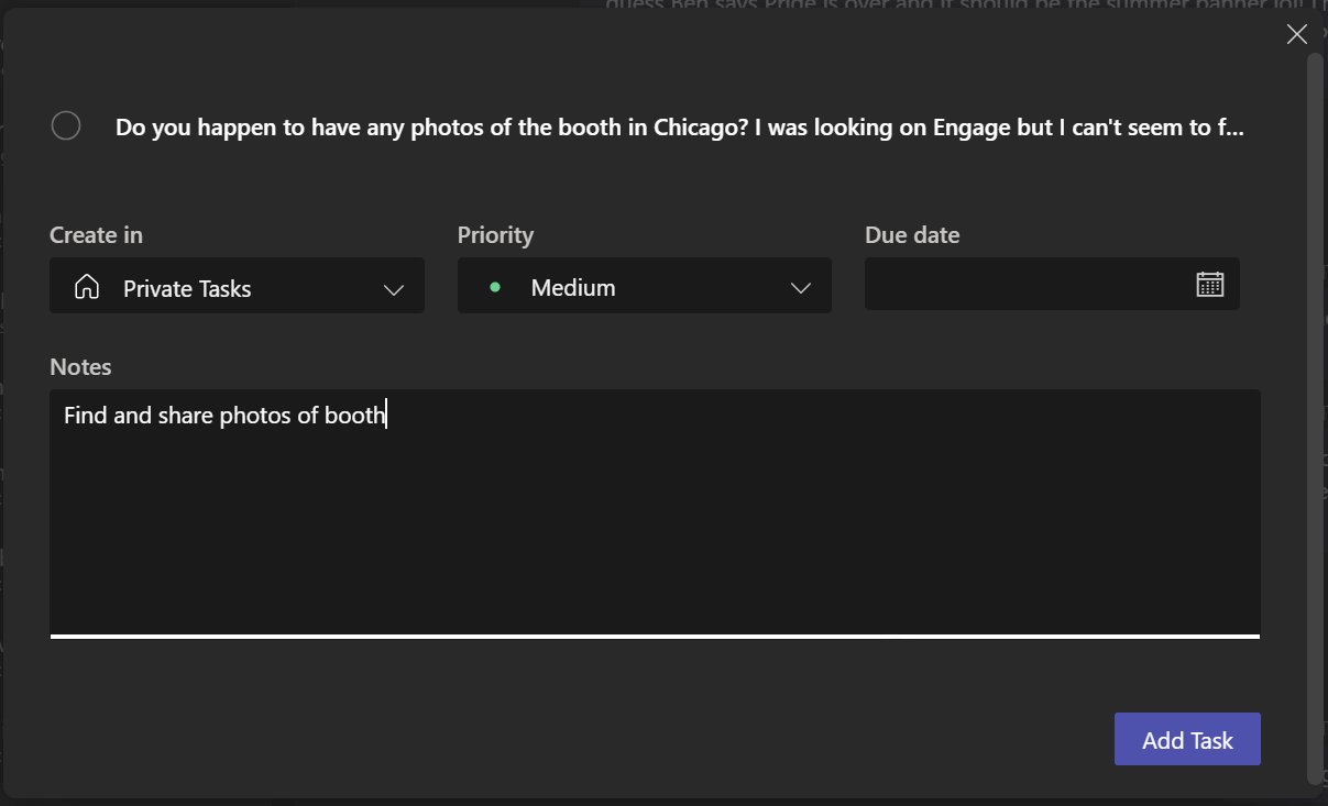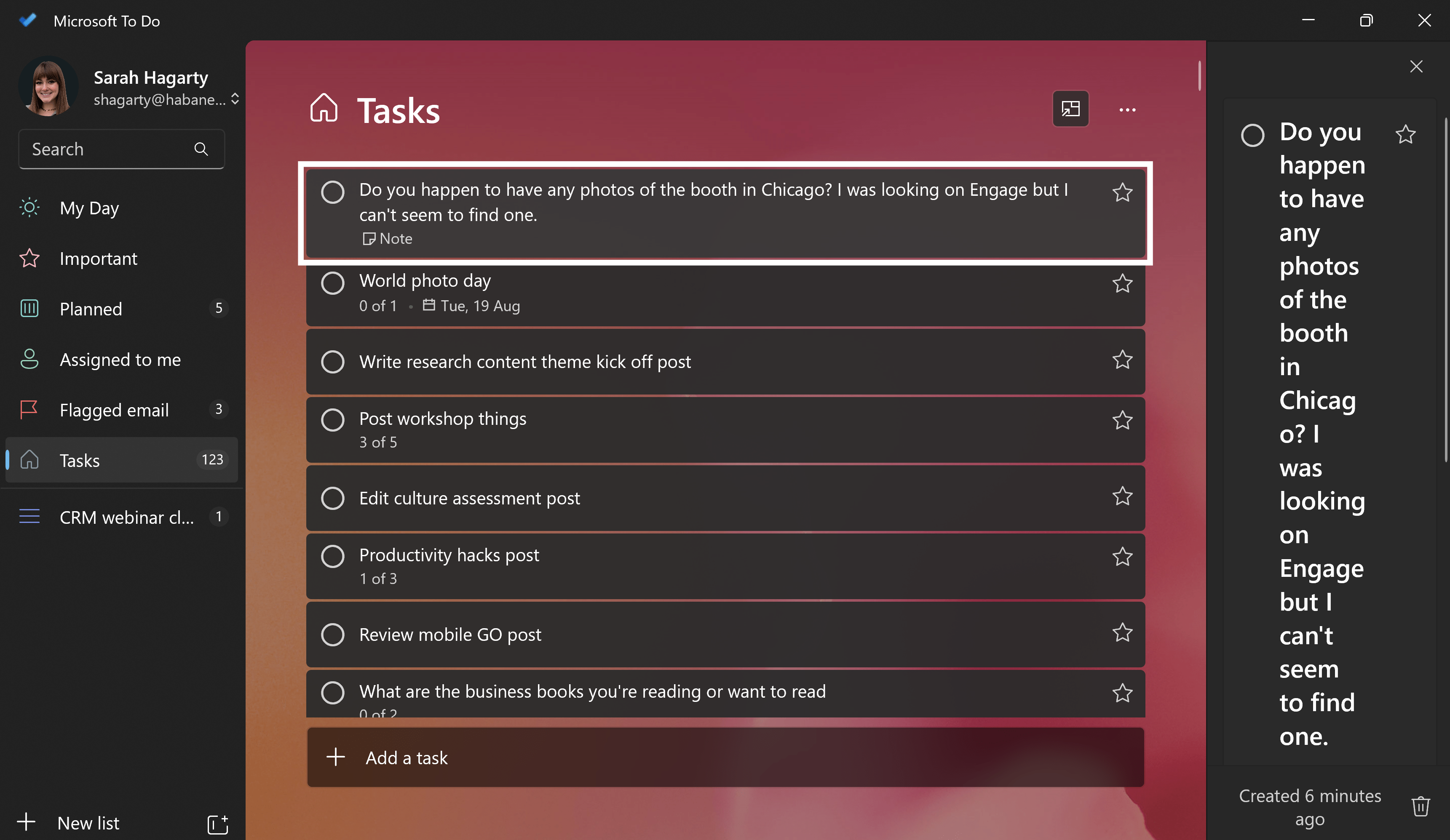 Digital Workplace Consultant Mike Dumka shared that turning messages into tasks in the Microsoft To Do app is very handy, especially when he's jumping from project to project and needs to get back to people.