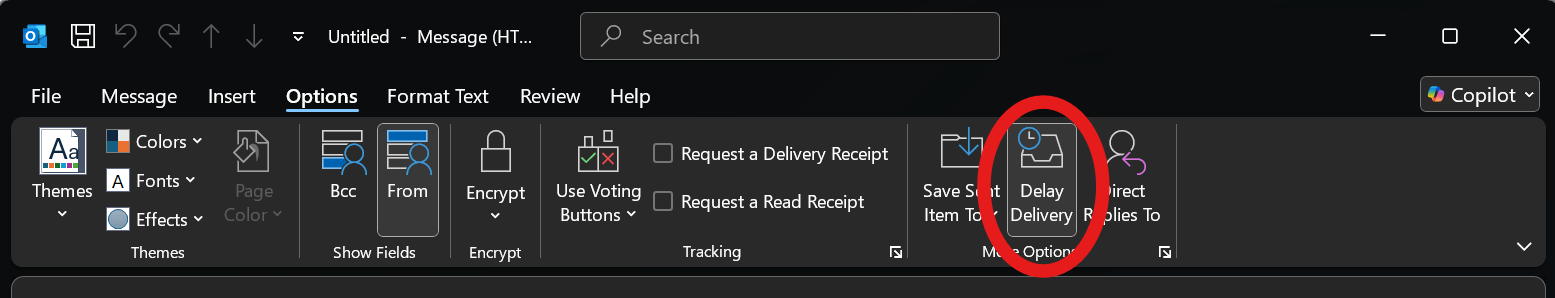 When composing your email in Outlook, navigate to Delay Delivery under Options.