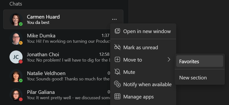 The ability to organize chats in Teams allows you to quickly access the conversations most important to you or that you use most often without having to scroll through endless chats to find the person you are trying to reach. You can add chats to your Favorites section or create custom sections to group-related chats.