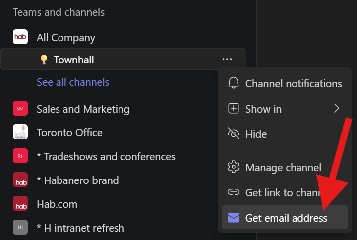 In Teams, go to the channel name, select More options (…) and choose Get email address.