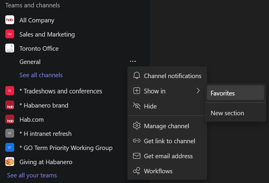 Similarly, to organize a Microsoft Teams channel into sections, select More options (…), then Show in (+) and choose the section where you want the team to live.