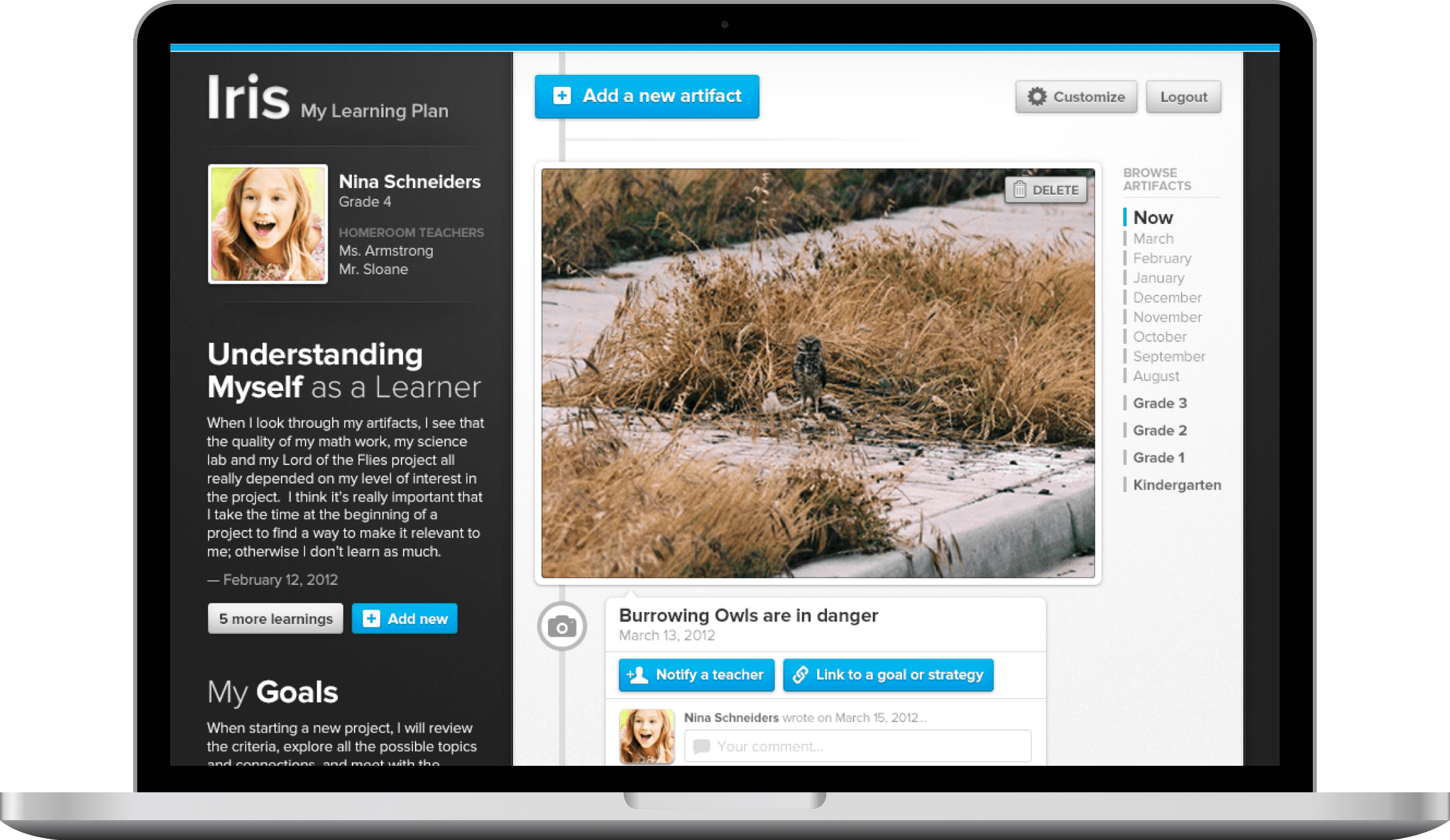 Here, students can write notes about their own goals, strategies, and progress – complete with the ability to add images and video. This profile is available for a student’s teacher to view as a way to keep up with each learner. Students can comment and post updates about their education, creating a timeline they can reflect on as they move through the school system.