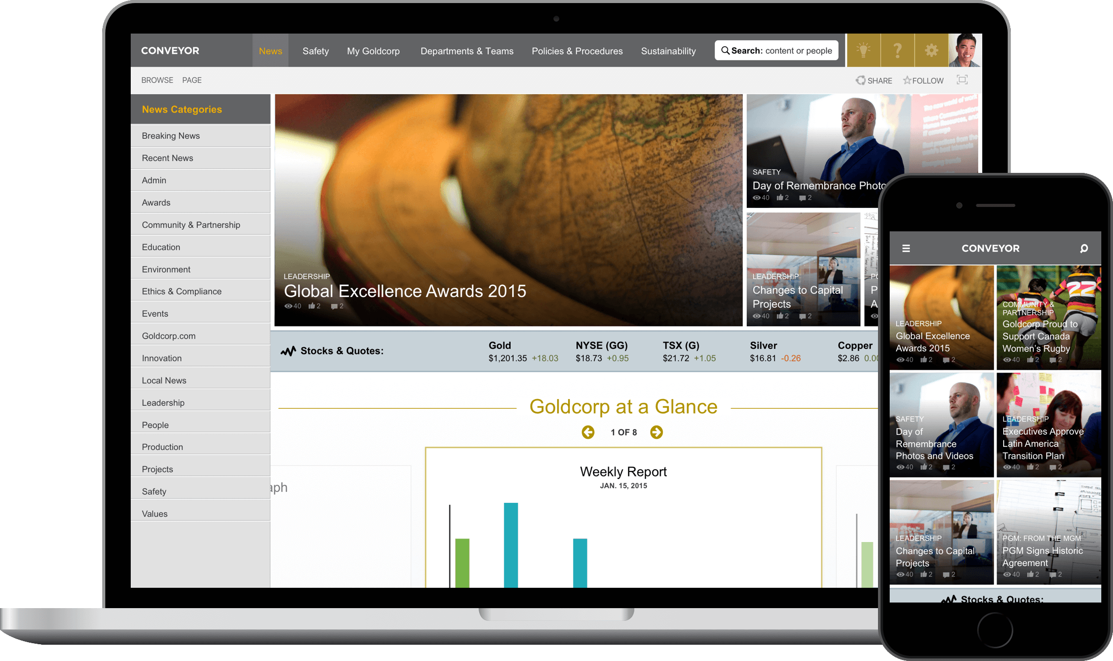 Instead of being a mix of news, summary links, and banners that you see in a traditional intranet, the new Conveyor has simplified the homepage to only focus on news. Content can be targeted and organized by recency, importance, user location, and language. Video is also surfaced into Conveyor from Qumu, Goldcorp’s enterprise video collaboration platform in key featured locations and through a traditional carousel format.