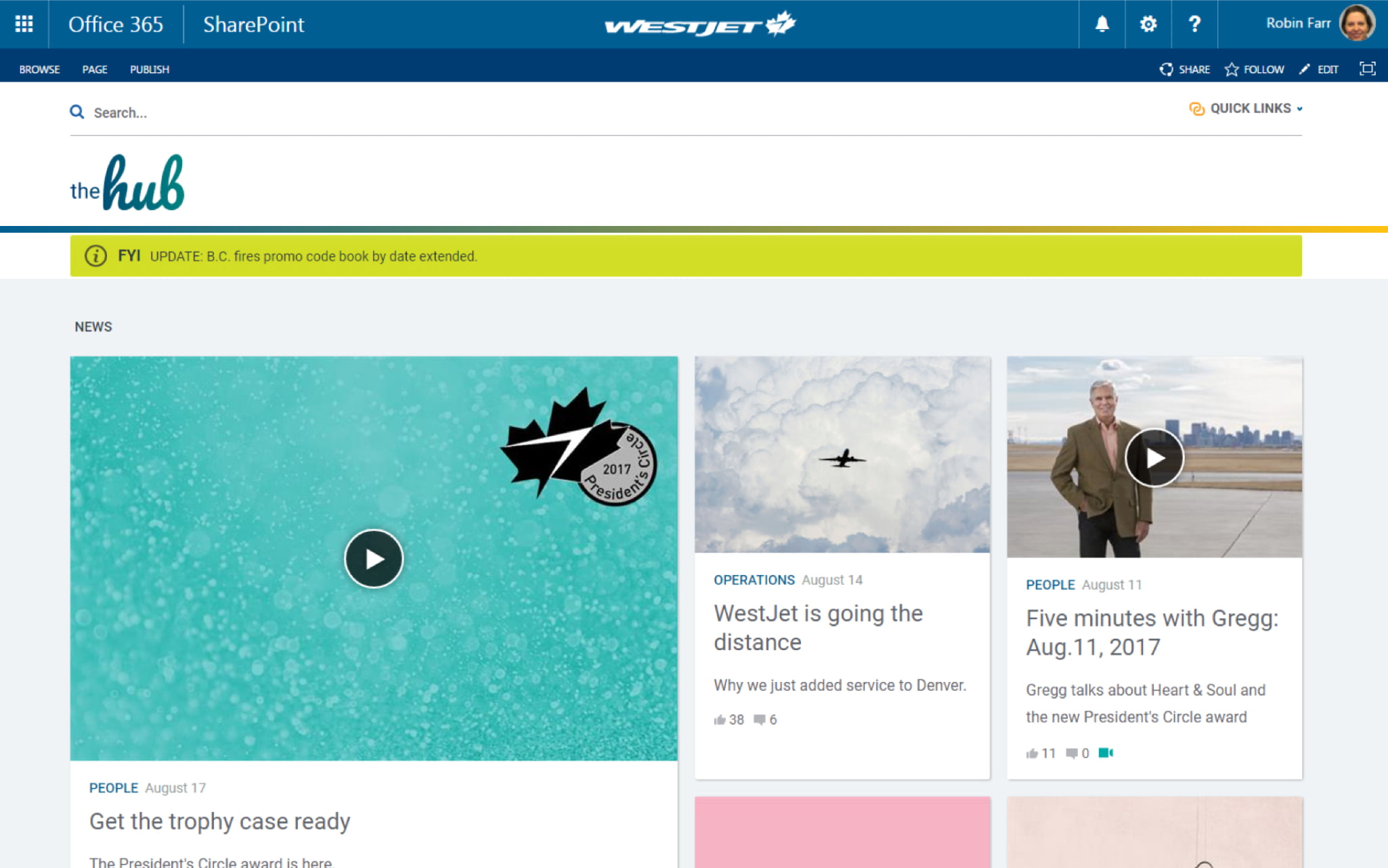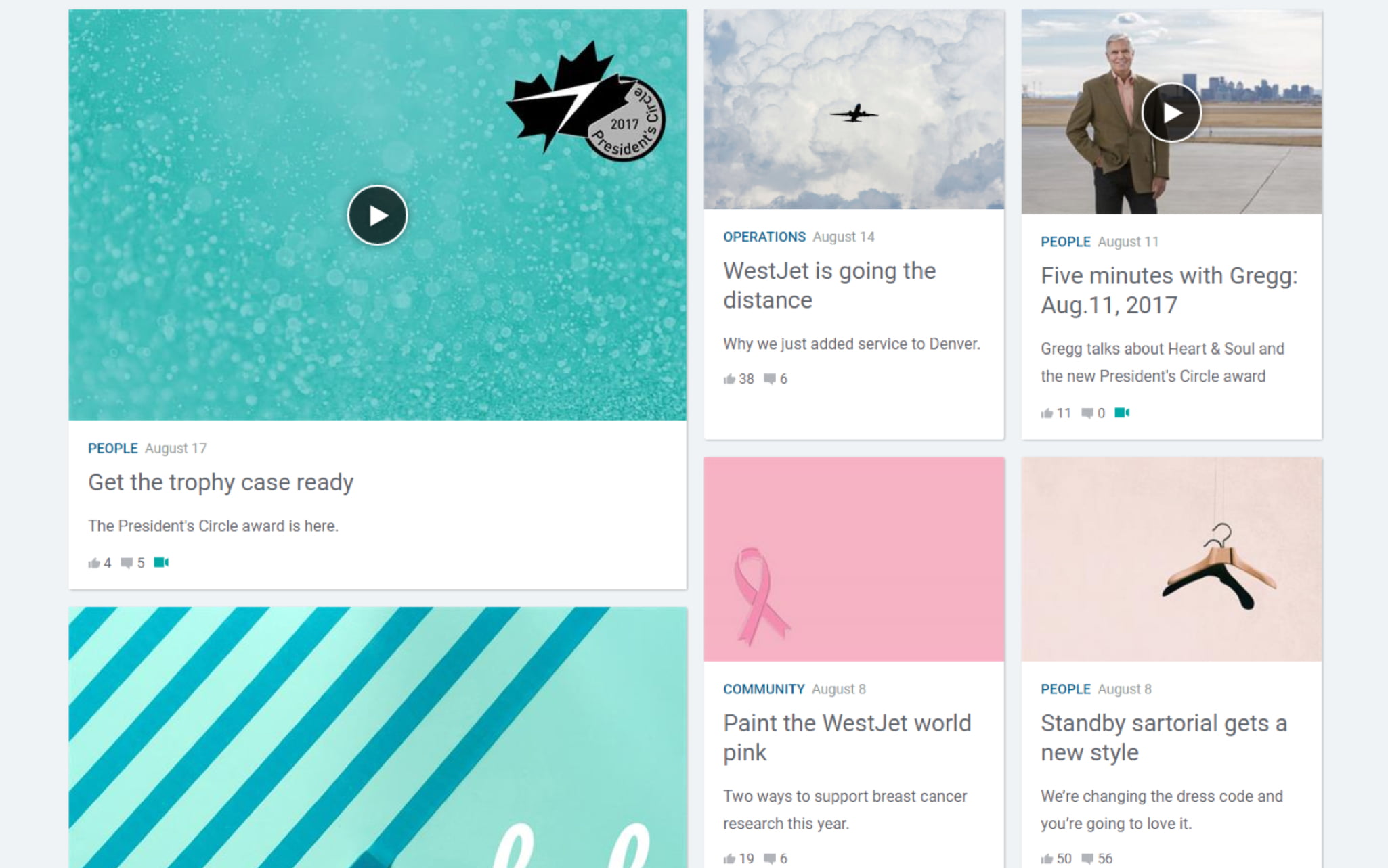Over the course of just seven weeks, Habanero’s experience designers, solution architects, developers, and infrastructure specialists collaborated with WestJet to refine the low-fidelity prototype, build on the initial requirements identified in the design sprint, and create a branded interface for the news portal now known as The Hub. With a simple URL and login, WestJetters can access The Hub from anywhere in the world to see important news, urgent alerts, and conversations about workplace topics that matter, thanks to its full integration with Yammer and Office 365.
