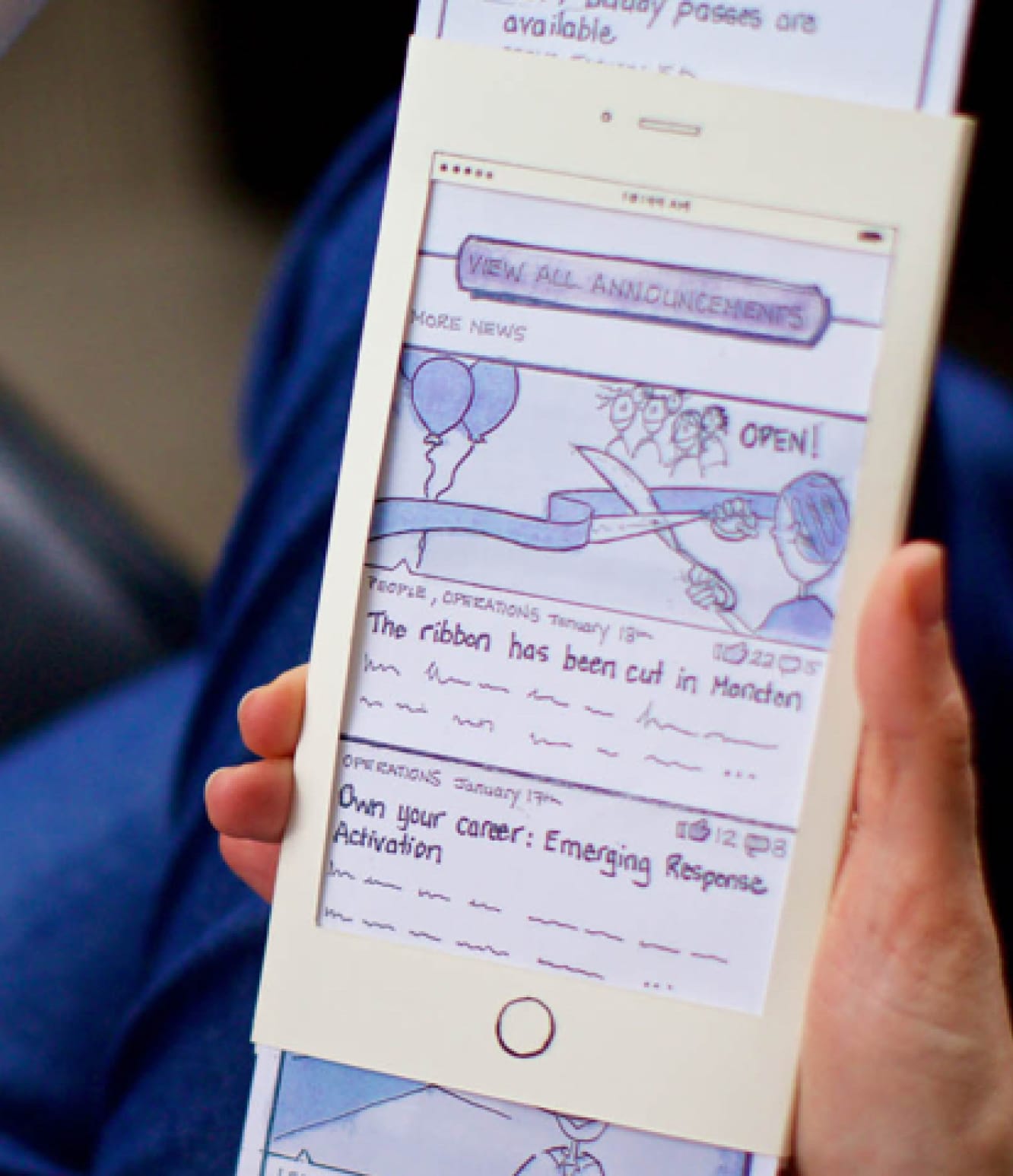 With a clear objective, Meghan and Sarah went to the drawing board. While Sarah parsed content from Westnet, Meghan sketched different prototypes. “Meghan’s sketches were fun, and they gave us a really good visual of what we could do,” says Robin. Using cardboard, paper, and Sharpies, Sarah and Meghan created more detailed versions of the sketches. The end result? A “mobile device” that simulated the user experience.